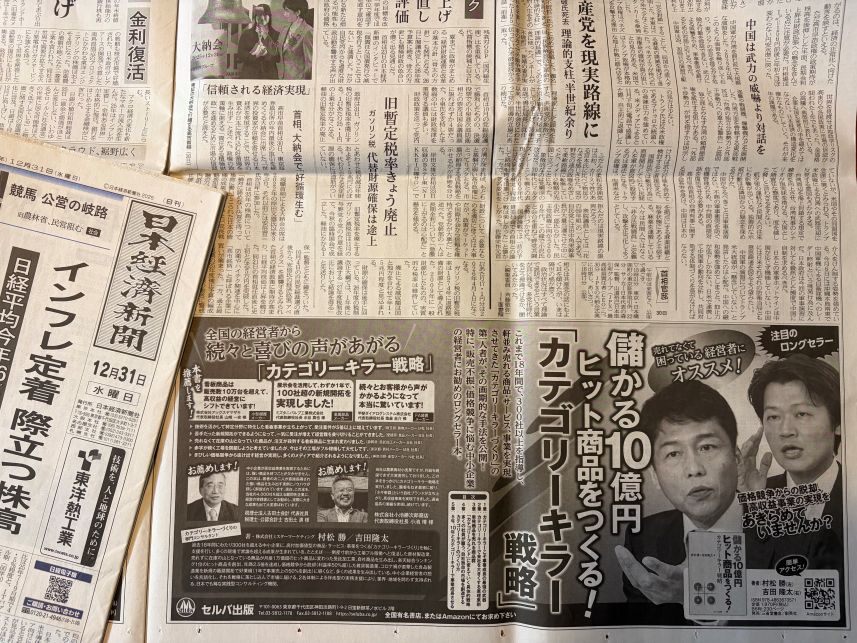 2025/12/31 日経新聞2面に当社書籍「儲かる10億円ヒット商品をつくる!カテゴリーキラー戦略」の広告が掲載されました。 2026.01.09 吉田 隆太 2025/12/31日経新聞2面に 当社書籍「儲かる10億円ヒット商品をつくる!カテゴリーキラー戦略」 の広告が掲載されました。 Amazonや当社サイトでも購入できます。 書籍名:儲かる10億円ヒット商品をつくる!カテゴリーキラー戦略 ※本書籍の詳細については、以下のサイトをご覧下さい。 →当社書籍サイトはこちら →Amazon販売サイトはこちら